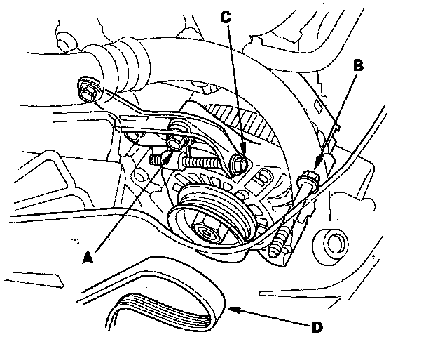 Drive Belt Replacement1. Loosen the lock bolt (A), the mounting bolt (B), and the adjusting bolt (C), then remove the drive belt (D).