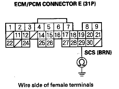 7. Check for continuity between ECM/PCM connector terminal E29 and body ground.