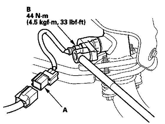 1. Disconnect the A/F sensor connector (A), then remove the A/F sensor (B).