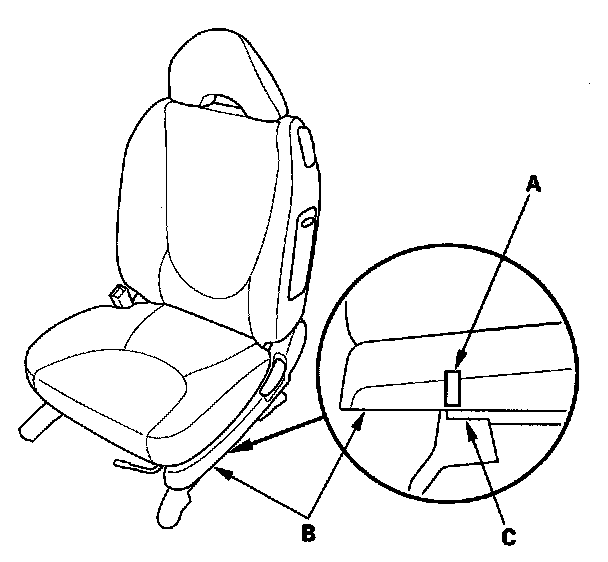 7. Using a piece of tape (A), mark the location on the seat's outer cover (B) where the front riser cover meets the seat riser (C). The driver's seat position sensor should read "NEAR."