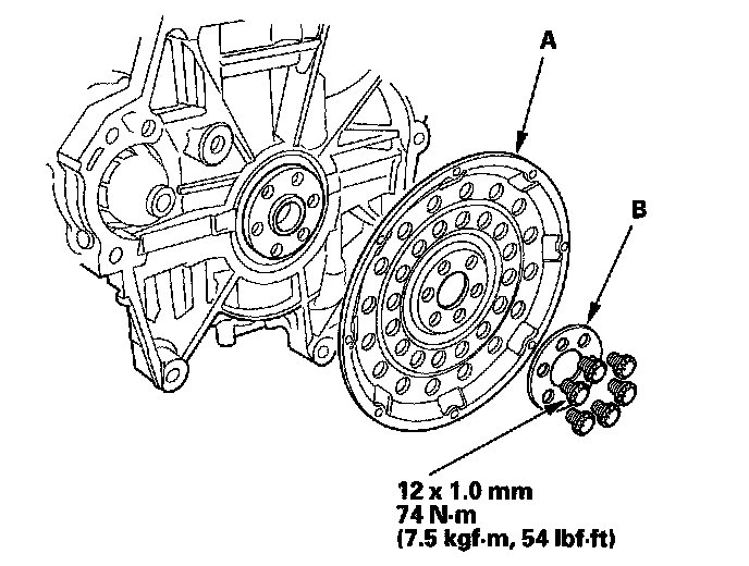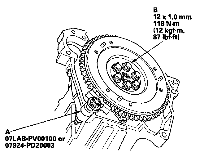 Torque the flywheel mounting bolts (B) in a crisscross pattern in several steps.