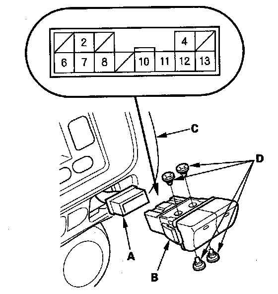 2. Disconnect the 13P connector (A) and push out the rear window defogger switch (without A/C) or the rear window defogger and A/C switch (with A/C) (B) from behind the center panel (C).