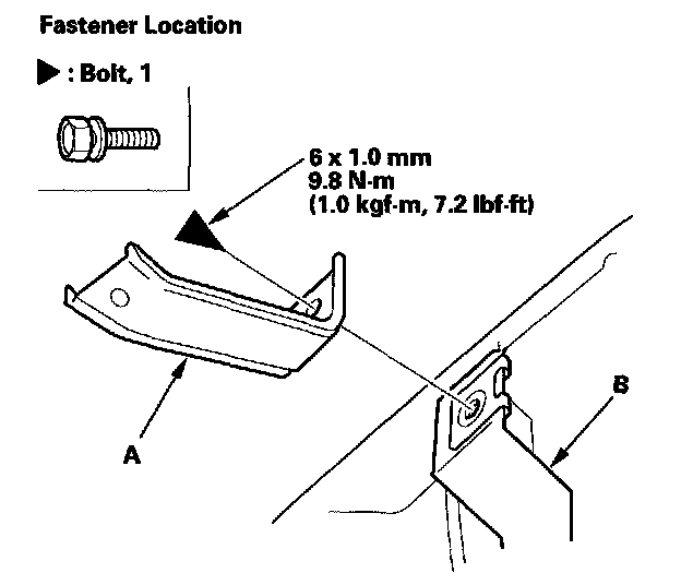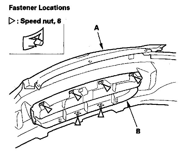 5. Remove the bolt, then remove the license plate base bracket (A) from the grille (B).