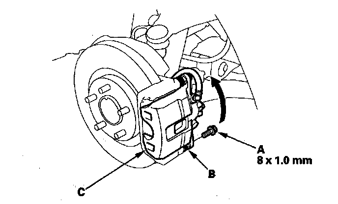 4. Remove the flange bolt (A) while holding the caliper pin (B) with a wrench and being careful not to damage the pin boot, and pivot the caliper (C) up out of the way. Check the brake hose and pin boots for damage and deterioration.