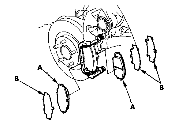 4. Using vernier calipers, measure the thickness of each brake pad lining. The measurement does not include the brake pad backing plate (A) thickness.