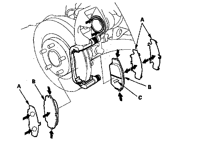 11. Install the brake pads and pad shims correctly. Install the brake pads with the wear indicator (C) on the lower inside. If you are reusing the brake pads, always reinstall the brake pads in their original positions to prevent a momentary loss of braking efficiency.
