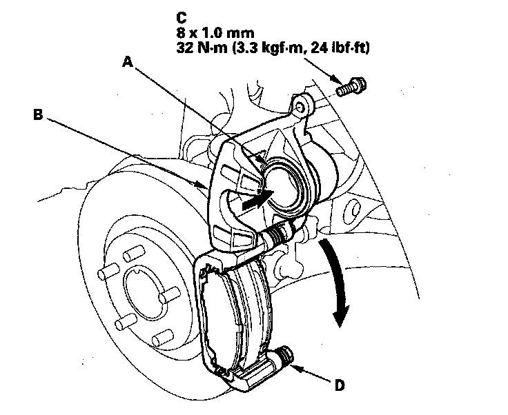 13. Pivot the caliper (B) down into position. Install the flange bolt (C), and tighten it to the specified torque while holding the caliper pin (D) with a wrench and being careful not to damage the pin boot.