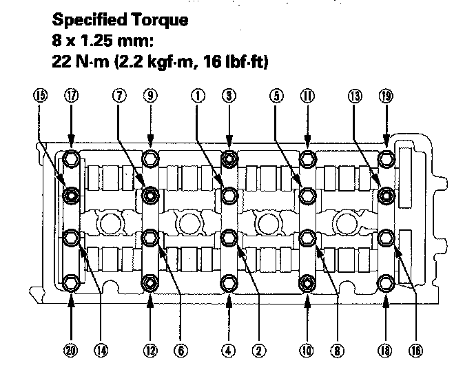 9. Install the camshaft holders, then tighten the bolts to the specified torque as shown in step 3.