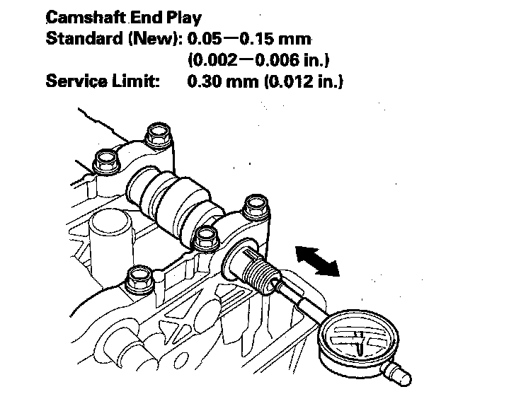 5. Zero the dial indicator against the end of the camshaft, then push the camshaft back and forth and read the end play. If the end play is beyond the service limit, replace the cylinder head and recheck. If it is still beyond the service limit, replace the camshaft.
