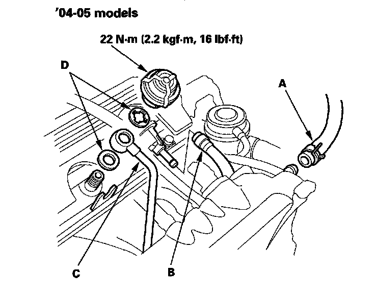 6. '00 - 05 models: Install the brake booster vacuum hose (A), fuel return hose (B) and fuel feed hose (C), using new washers (D).