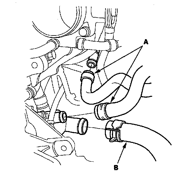 10. Install the heater hoses (A) and the lower radiator hose (B).