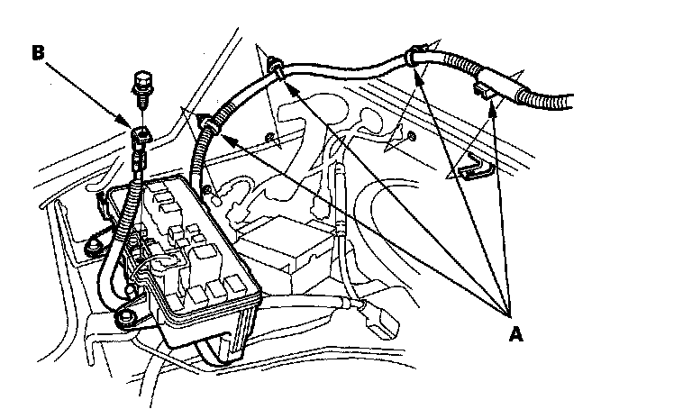 16. Install the harness clamps (A), then install the battery cable (B) on the main under-hood fuse/relay box.