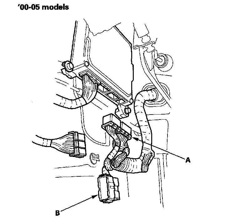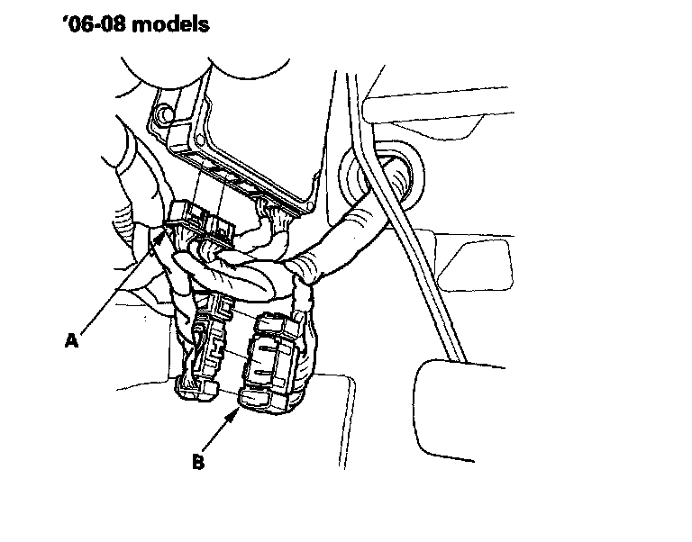 20. Connect the ECM connectors (A) and dashboard wire harness A connectors (B).