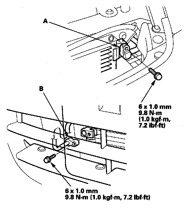 4. Remove the bolts, then disconnect the discharge line (A) and the A/C condenser line (B) from the A/C condenser. Plug or cap the lines immediately after disconnecting them to avoid moisture and dust contamination.
