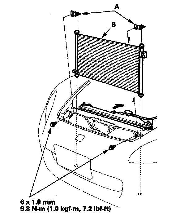 5. Remove the bolts and the upper mount brackets (A), then remove the A/C condenser (B) by lifting it up. Be careful not to damage the radiator or the A/C condenser fins when removing the A/C condenser.