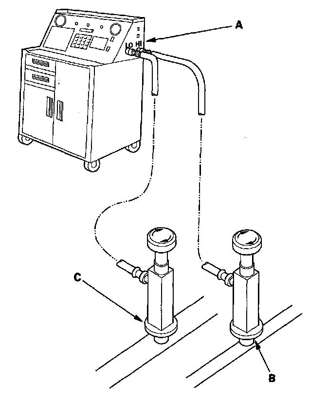 1. Connect an R-134a refrigerant recovery/recycling/charging station (A) to the high-pressure service port (B) and the low-pressure service port (C), as shown, following the equipment manufacturer's instructions.