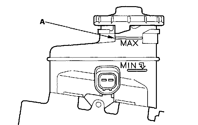 1. Make sure the brake fluid level in the reservoir is at the MAX (upper) level line (A).