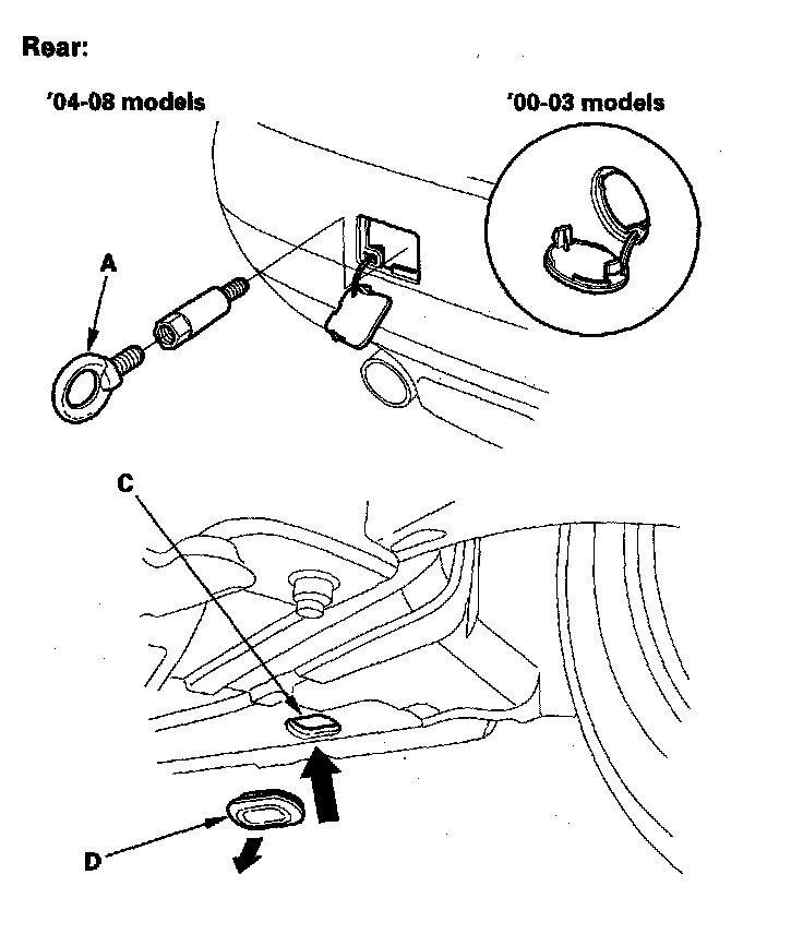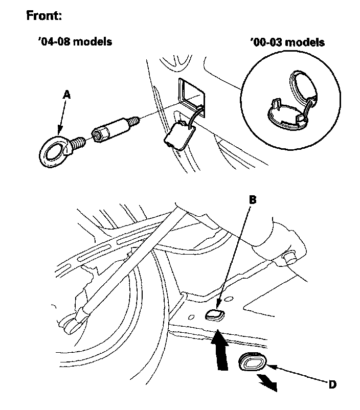 NOTE: The tie down hook slots use rubber plugs (D) to cover the openings.