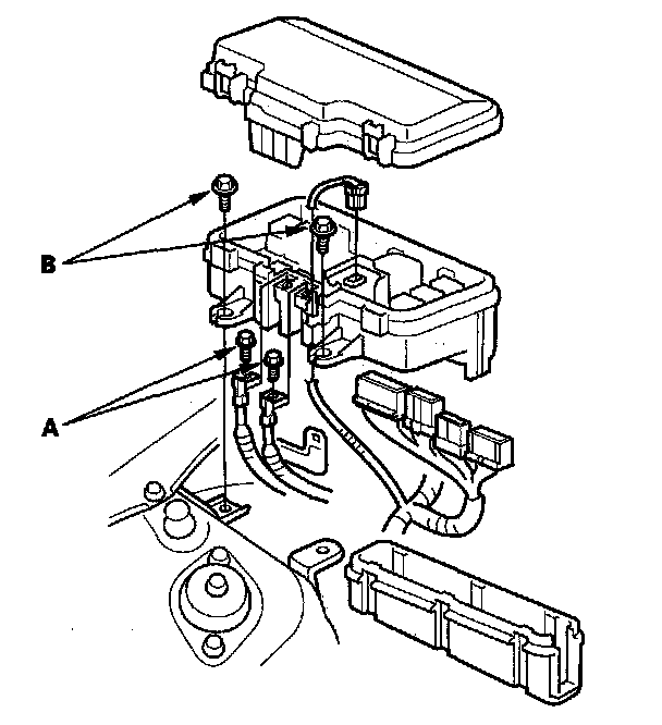 5. Remove the bolts (B) securing the main under-hood fuse/relay box.