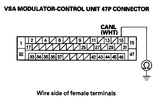 14. Check for continuity between VSA modulator-control unit 47P connector terminal No. 15 and body ground.