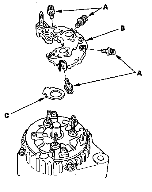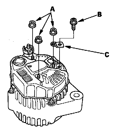 4. Remove the three flange nuts (A) and the screw (B) from the alternator, then remove the terminal plate (C).