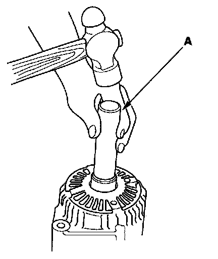 16. Support the stator housing in a vise, and drive out the front bearing with a brass drift (A) and hammer.