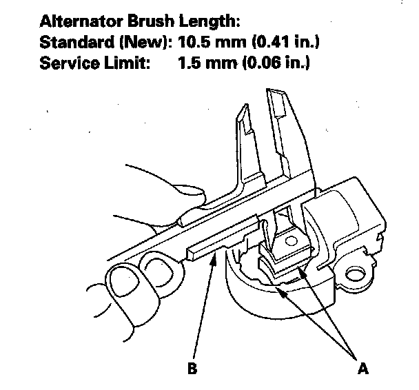 19. Measure the length of both brushes (A) with a vernier caliper (B).