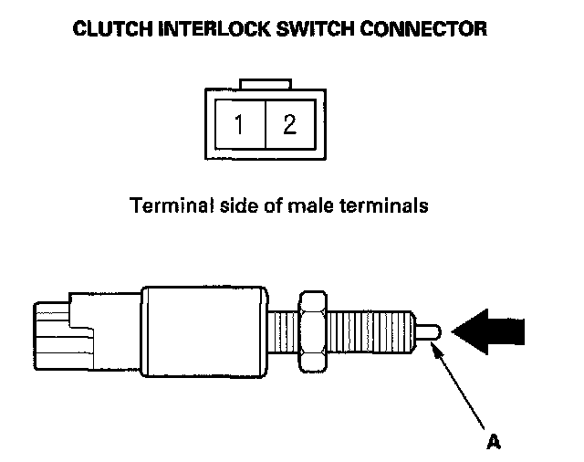 2. Check the clutch interlock switch connector terminals for continuity. There should be no continuity between the terminals with the button (A) released, and there should be continuity with the button pressed.