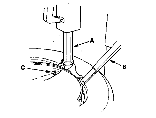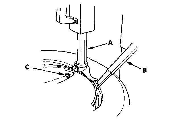5. Position the wheel so the tire machine (A) and, tire iron (B) are next to the valve stem (C) and will move away from it when the machine starts. Then remove the tire from the wheel.