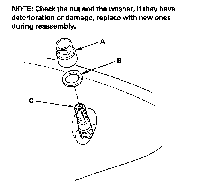 6. Remove the valve stem nut (A) and washer (B), then remove the tire pressure sensor with valve stem (C) from the wheel.