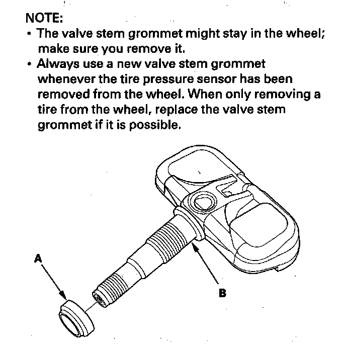 7. Remove and discard the valve stem grommet (A) from the tire pressure sensor (B).