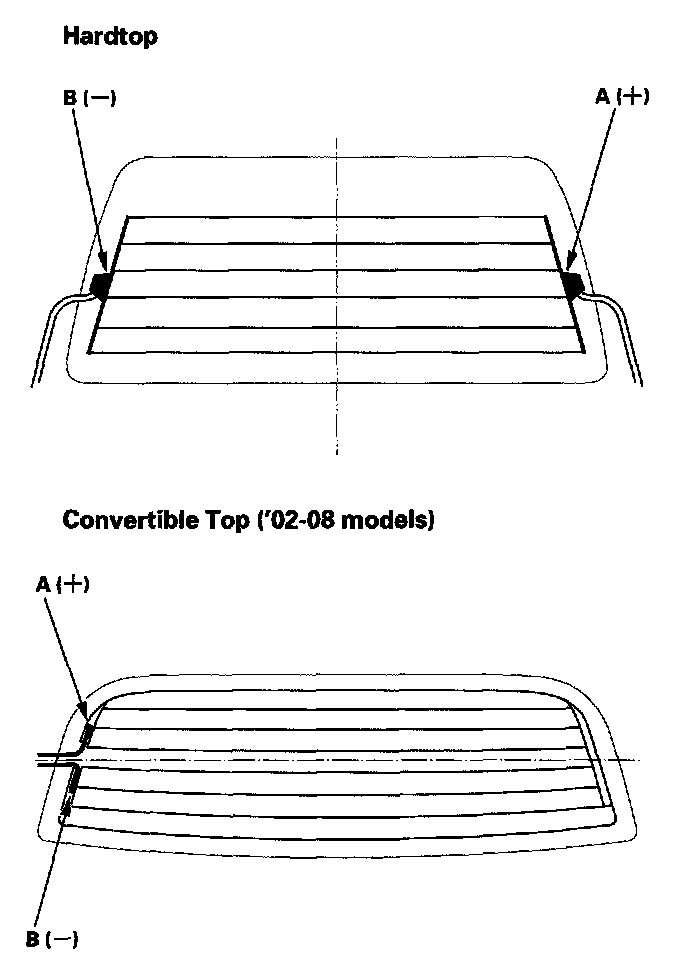 1. Measure the voltage between the positive terminal (A) and body ground with the ignition switch and defogger switch ON. There should be battery voltage.