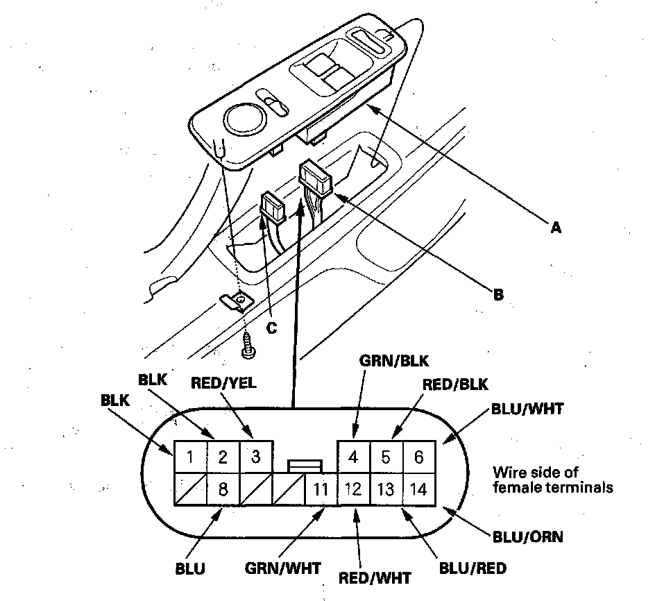 3. Disconnect the 14P connector (B) and the 10P connector (C) from the power window master switch.