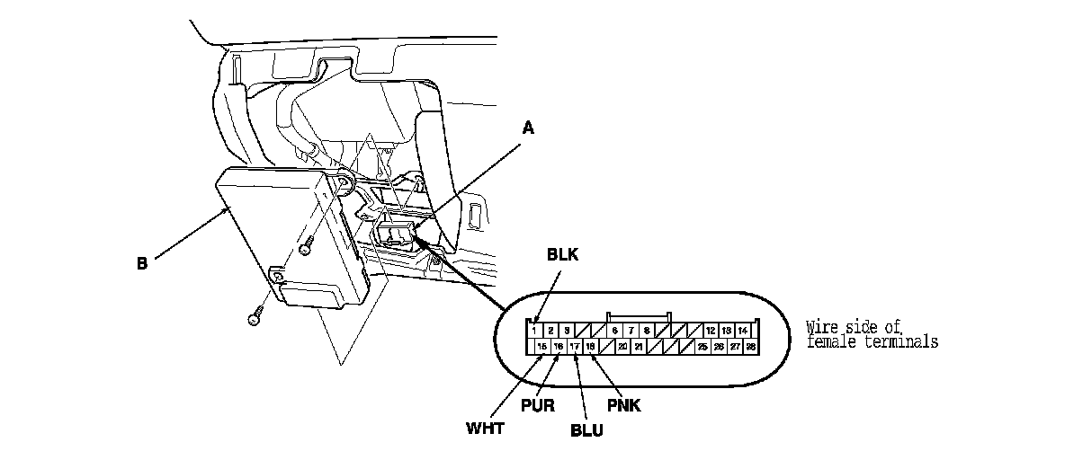 2. Remove the HandsFreeLink control unit screws, then disconnect the 28P connector (A) from the HandsFreeLink control unit (B).