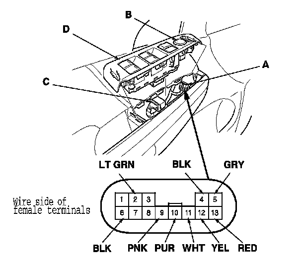 2. Disconnect the 13P connector (A) from the power mirror switch (B) and 37P connector (C) from the power window master switch (D).