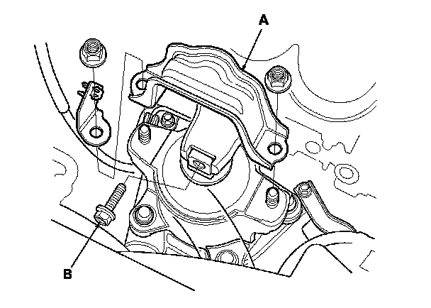 6. Remove the front engine mount stop (A), then remove the front engine mount bolt (B).