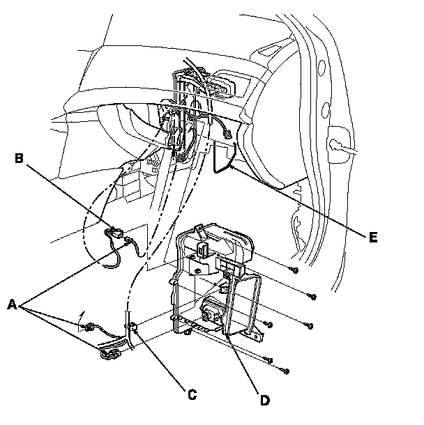 6. Disconnect these connectors (A): The evaporator temperature sensor, the power transistor, and the passenger's air mix control motor (with climate control). Remove the connector clip (B) and the harness clip (C). Remove the self-tapping screws, the expansion valve cover (D), and the seal (E).