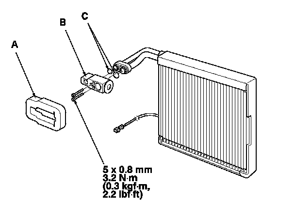 2. Remove the insulator (A) and bolts, then remove the expansion valve (B) and O-rings (C).