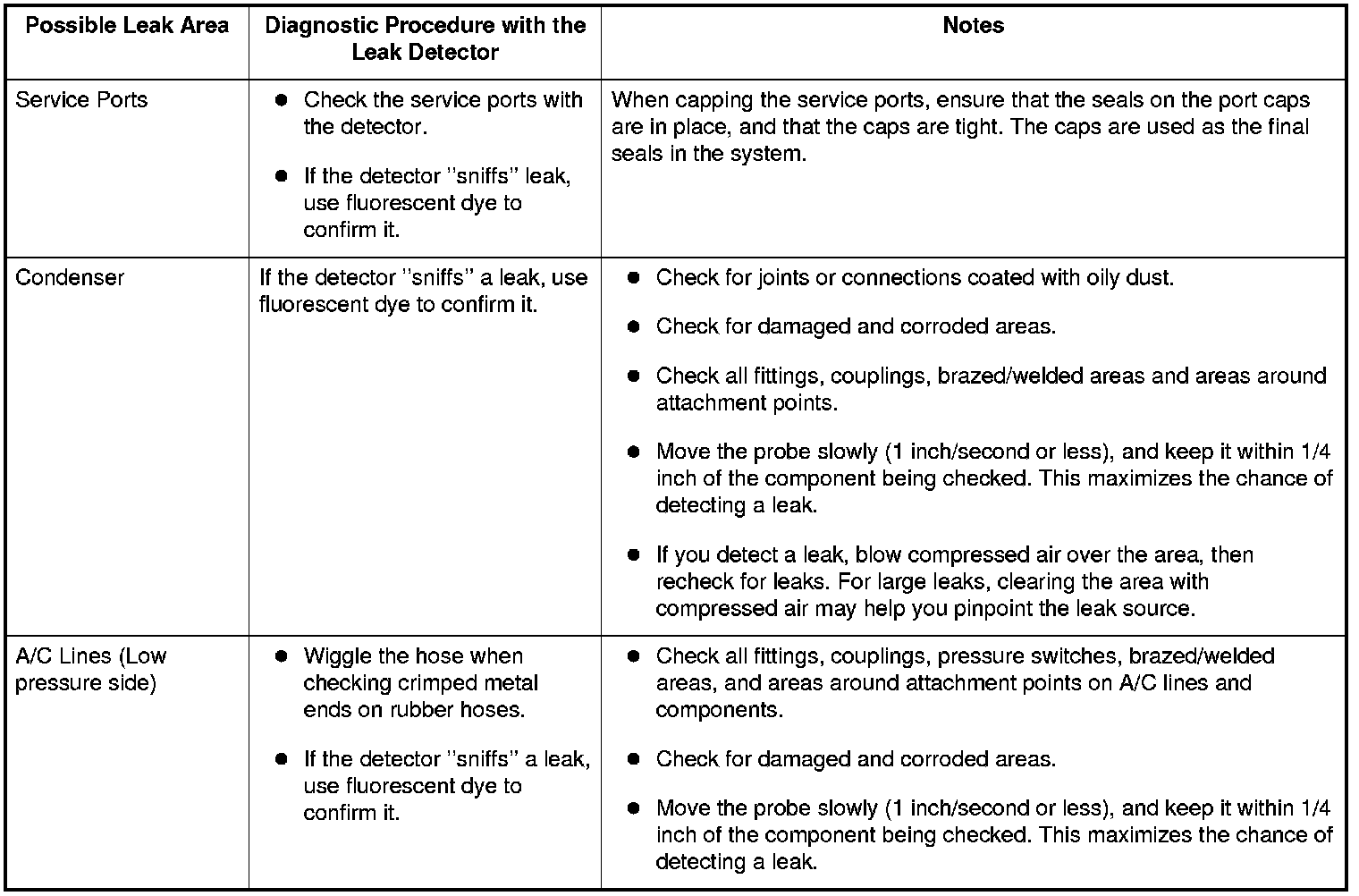 - R-134a is heavier than air; always check below and to the sides of all potential leak sources.