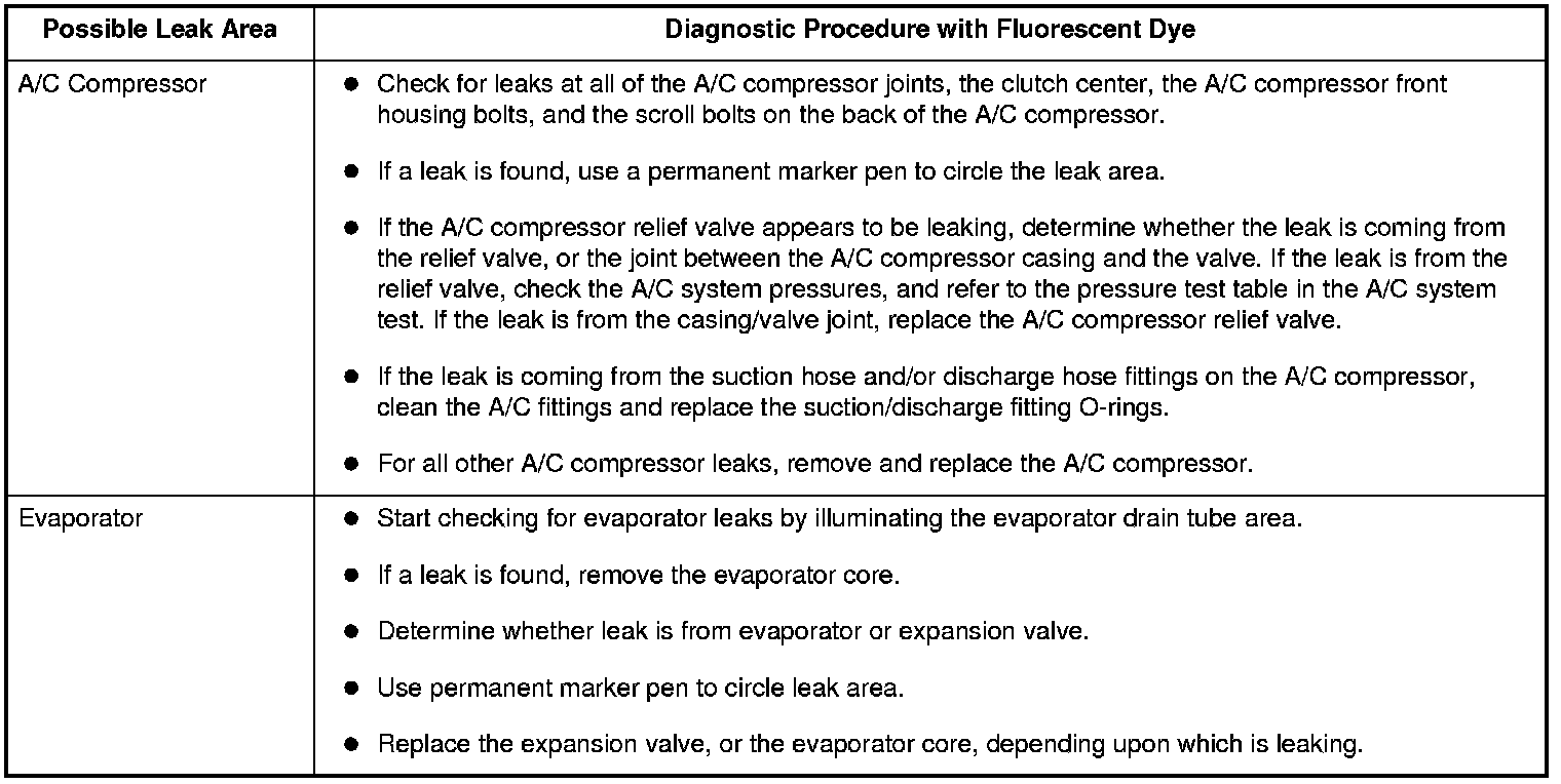 11. Run the engine and A/C system for 15 minutes to thoroughly circulate the dye. Then shut the engine off, and inspect the following areas of the system for leaks: