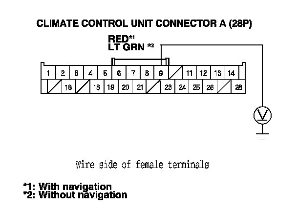 4. Measure the voltage between the climate control unit connector A (28P) No. 9 terminal and body ground.