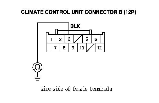 6. Check for continuity between the climate control unit connector B (12P) No. 3 terminal and body ground.