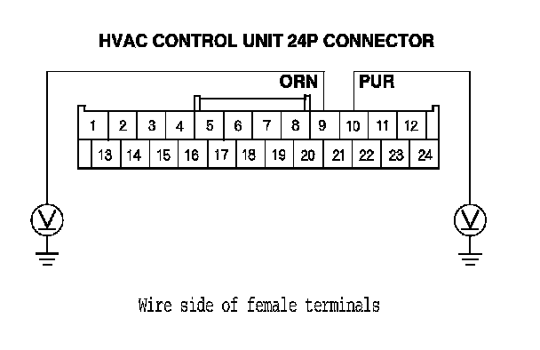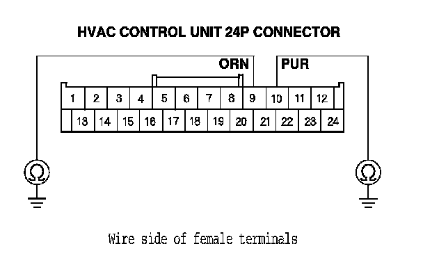 8. Check for continuity between body ground and the HVAC control unit 24P connector No. 9 and No. 10 terminals individually.