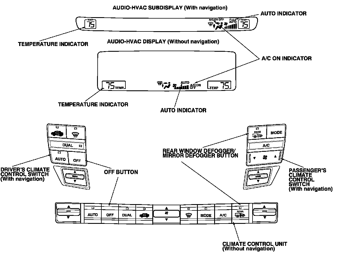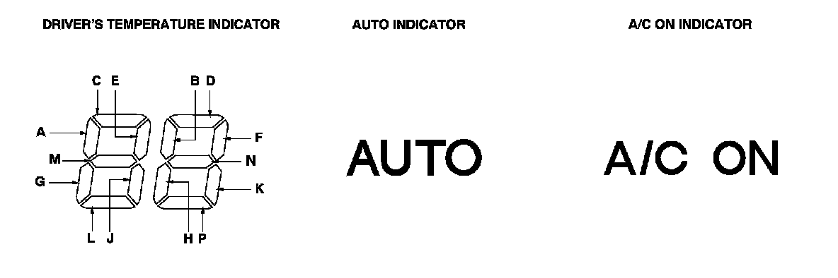 NOTE: If indicator segments A, C, D, E, G, K, and the AUTO indicator or the A/C ON indicator, are on at the same time, there may be an open in the climate control unit ground circuit.