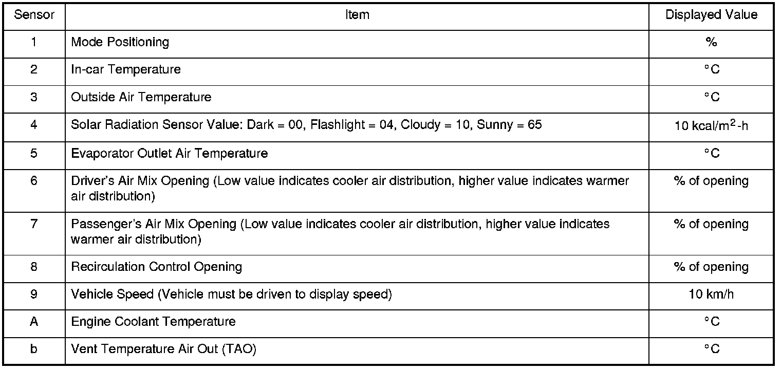 The climate control unit has a mode that displays sensor inputs it receives. This mode shows you what the climate control unit is receiving from each of the sensors, one at a time, and it can help you determine if a sensor is faulty.
