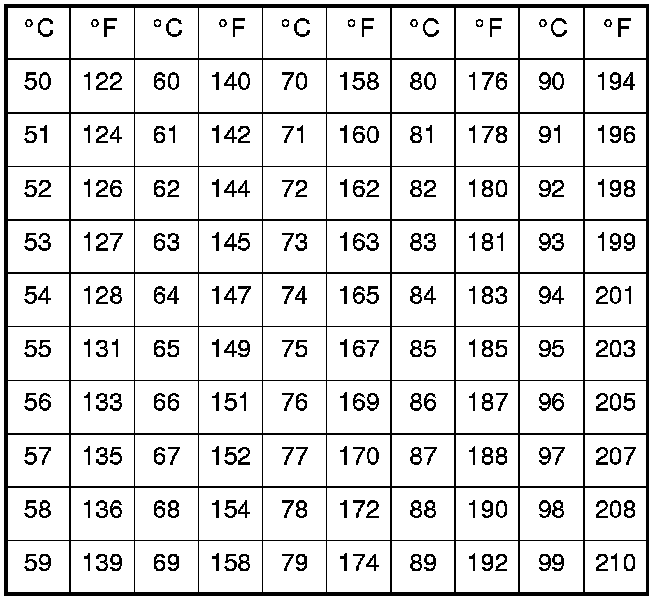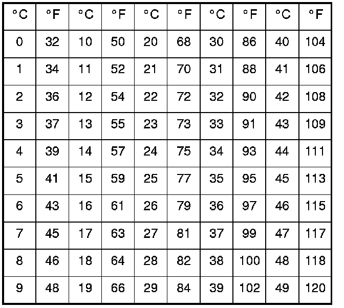 Celsius to Fahrenheit Conversion Table