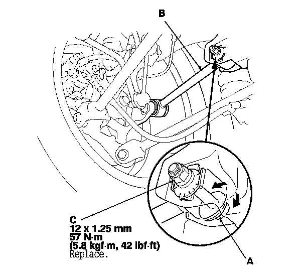 3. Hold the adjusting bolt (A) on the rear control arm (B), and loosen the self-locking nut (C).