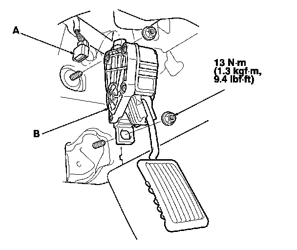 2. Remove the accelerator pedal module (B).