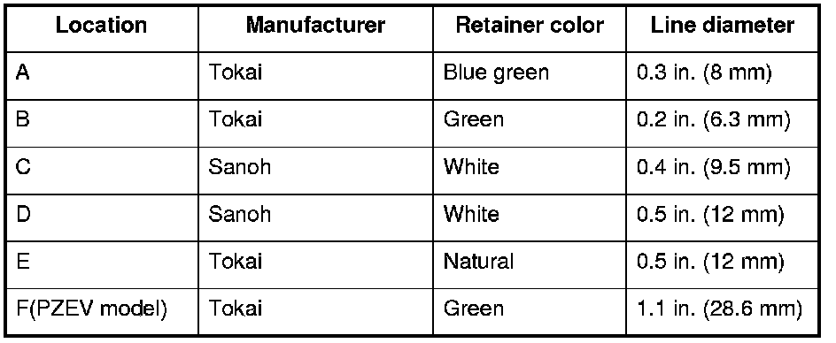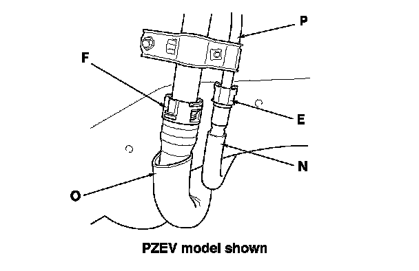 The fuel line/quick-connect fittings (A), (B), (C), (D), (E), and (F) connect the fuel rail (G) to the fuel feed hose (H), the fuel feed hose to the fuel line (I), the fuel line (J) to the fuel tank unit (K), the fuel vapor line (L) to the EVAP canister (M), and the fuel tank vapor recirculation tube (N) (PZEV model, and fuel fill neck tube (O) to the fuel fill pipe (P)). When removing or installing the fuel feed hose, the fuel tank unit, or the fuel tank, it is necessary to disconnect or connect the quick-connect fittings.