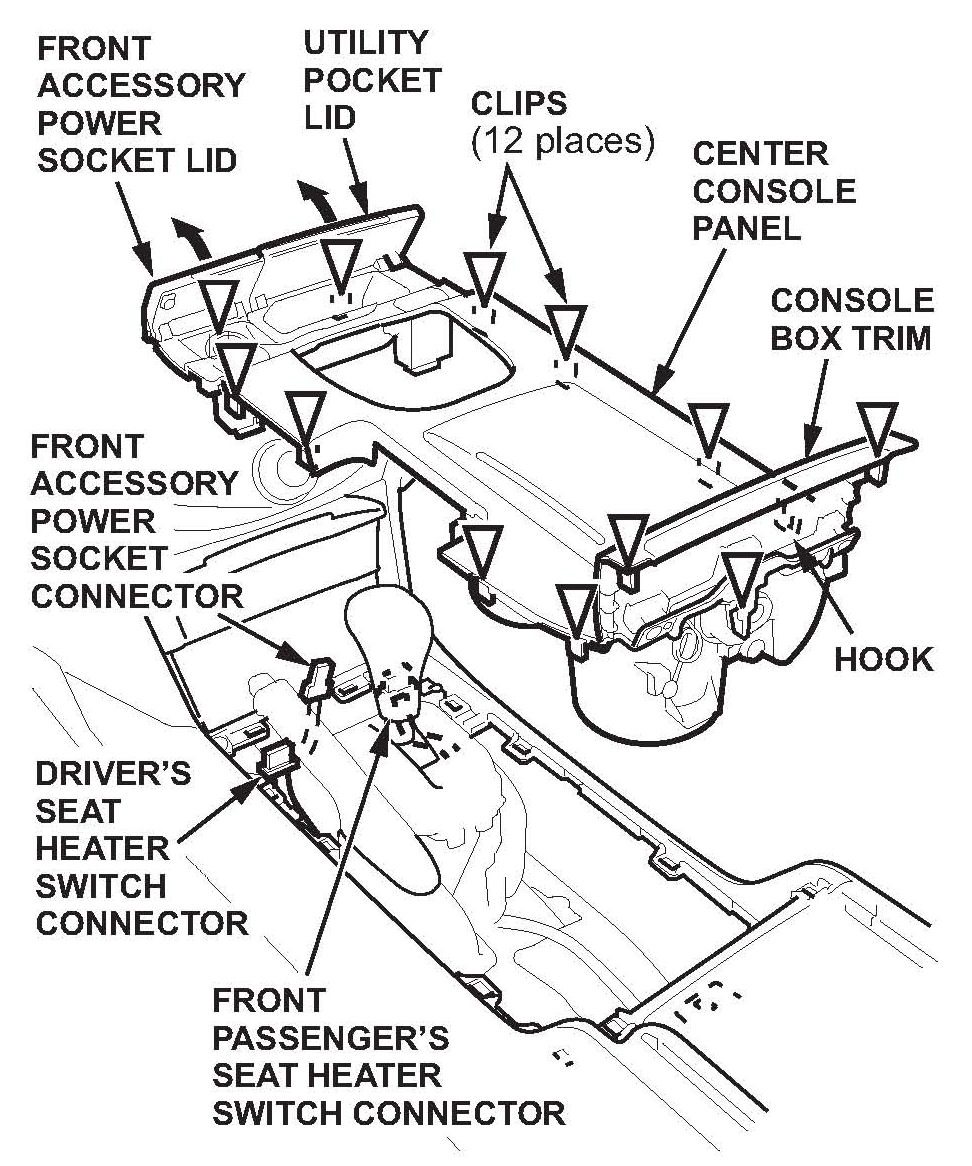 ^ Disconnect the front accessory power socket connector. On vehicles with front seat heaters, disconnect the driver's seat heater switch connector and the front passenger's seat heater switch connector.